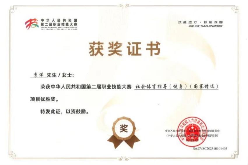 中华人民共和国第二届职业技能大赛由人社部主办,天津市人民政府承办,于2023年9月16日至19日在天津举办。在社会体育指导(健身)项目竞赛中,李洋老师不畏强手,充分展现学院青年教师的竞赛风采,在比赛中奋勇拼搏最终脱颖而出获得优胜奖。所取得的优异成绩来自扎实的理论知识和争分夺秒苦练技能的日常积累,得益于近年学院持续推进教师队伍建设、提高教师教学能力所取得的积极成果。接下来,学院将继续弘扬冠军精神、工匠精神,激励青年一代走技能成才、技能报国之路,培养更多高技能人才和大国工匠,为全面建设社会主义现代化国家提供有力人才保障。
