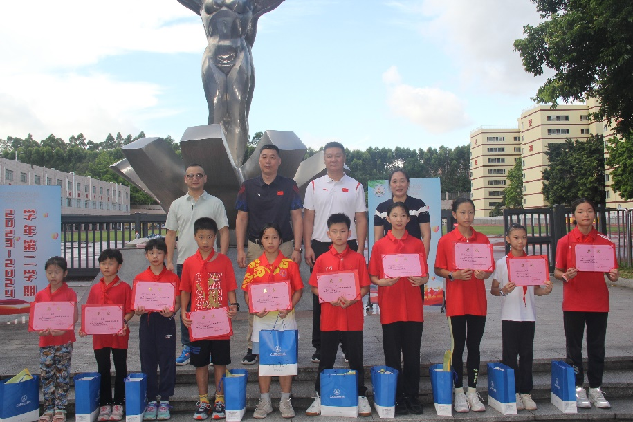 紧接着,进入了激动人心的学生表彰环节。学院附属学校校长黄克铭和训练竞赛处处长陈祺为获得省、市级“红领巾奖章”称号的学生和班级颁发奖章和奖匾;附属学校副校长粟韵霞、训练竞赛处副处长贾志勇、训练竞赛处副处长张威峰和重竞技运动管理中心副主任那日苏分别为这学期期末评优的学生代表颁发了奖状证书。通过表彰优秀学生和优秀班级,不仅激励了获奖学生继续努力,也为全校学生树立了榜样。