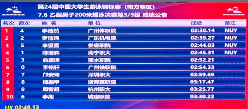 在男子200米蝶泳(金牌)项目争夺中,广州体职院运动员李浩然在该项第3组4道,以稳定的入水节奏展开激烈角逐,凭借精湛的技术和强大的心理素质,一马当先,最终以2分30秒14的成绩刷新赛事记录摘得桂冠,将原记录提升了19秒。