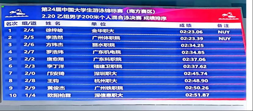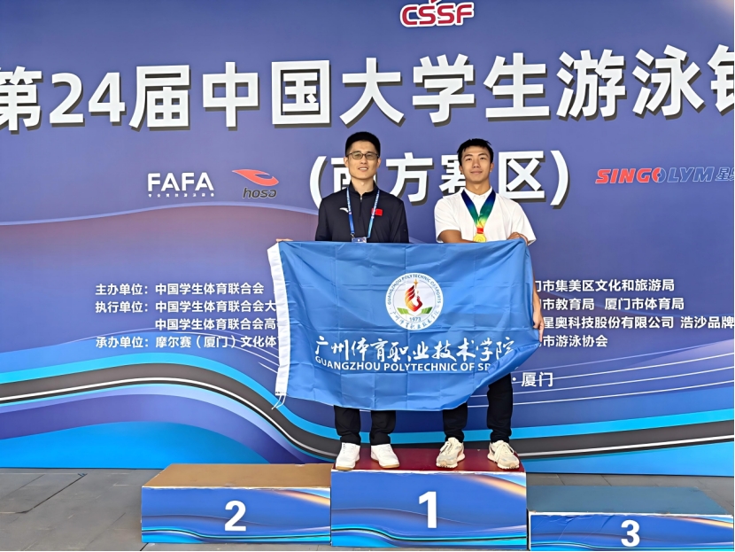 本网讯 11月7日-13日,2025年第24届中国大学生游泳锦标赛(南方赛区)在厦门奥林匹克体育中心白海豚游泳馆举办,广州体育职业技术学院首次组队参加国家级游泳赛事,选派的李浩然同学发扬学院冠军精神,勇夺1金1银,并打破2项赛会纪录。根据竞赛规程按照,获得总决赛参加资格。