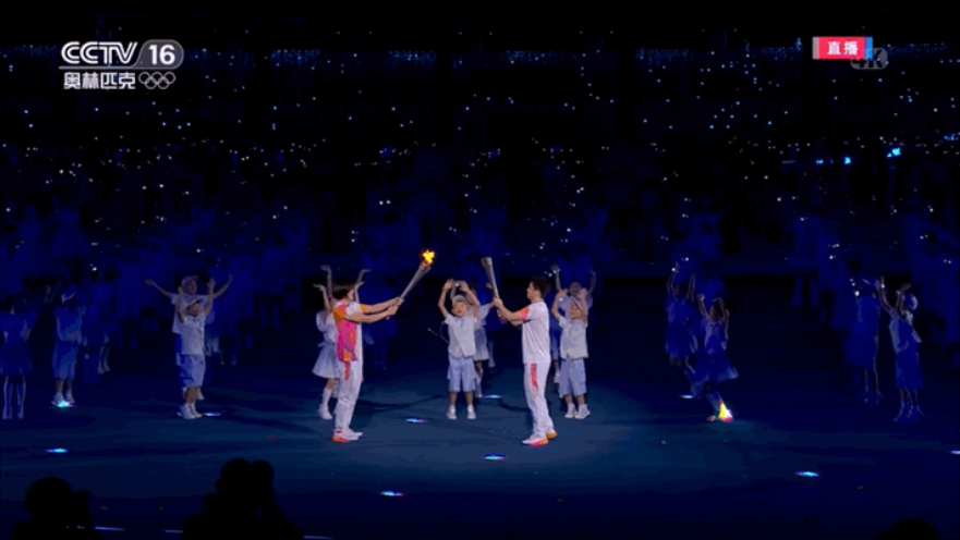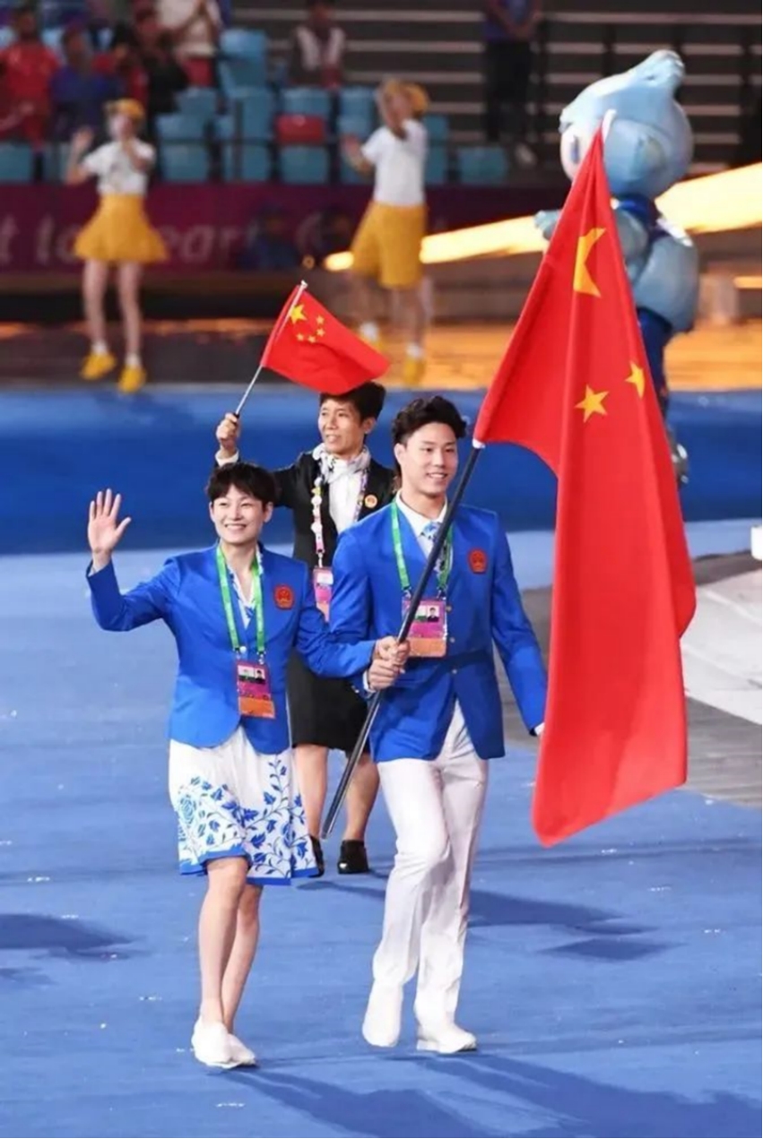 在《歌唱祖国》的伴奏下,中国体育代表团篮球运动员杨力维和游泳运动员覃海洋共持五星红旗,引领阵容强大的中国代表团入场。